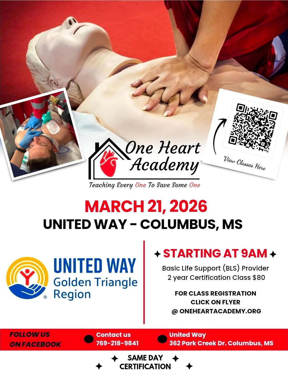 One Heart Academy, LLC emphasizes the importance of timely intervention in emergency situations, making our training impactful for all. Our mission is to “Teach Every One to Save Some One.” Join us to learn how to save lives and make a difference in your community. BLS skills Only Sessions begin at 5 p.m. All other classes begin at 6 p.m. on all available dates.